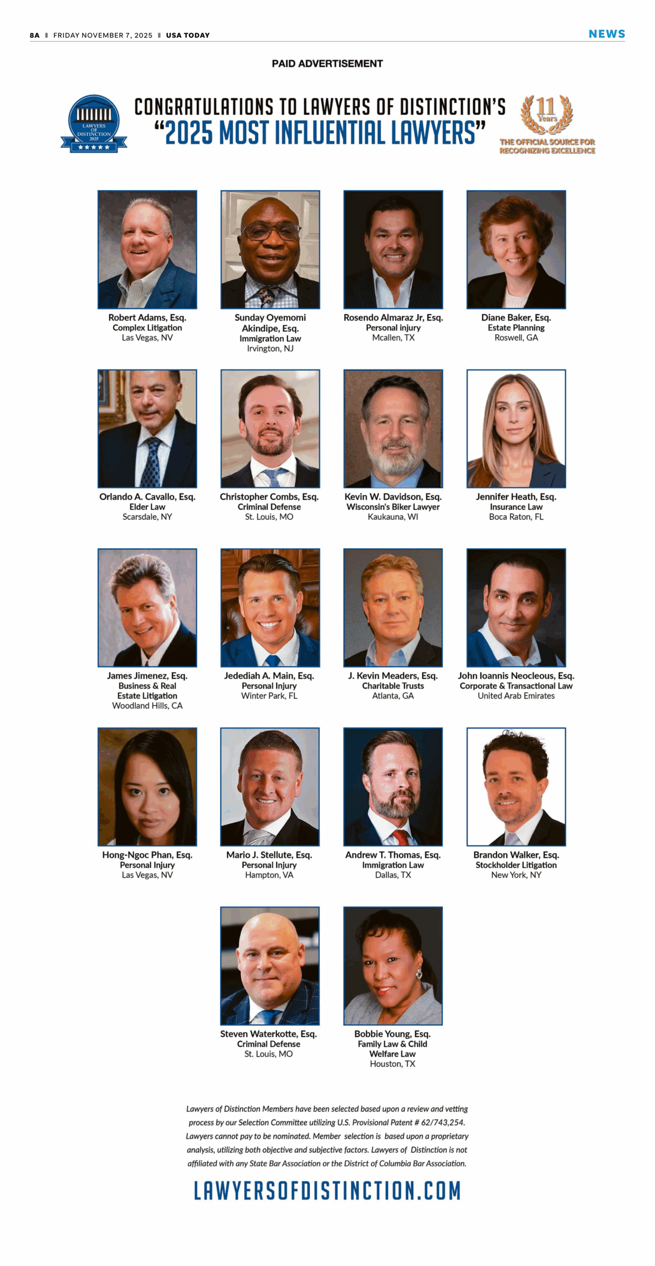 Lawyers of Distinction’s 2025 ‘Most Influential Lawyers’ Featured in USA Today – November 7th, 2025 Edition